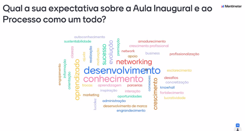 Após as apresentações institucionais, os empreendedores participaram de uma dinâmica de expectativas na qual cada pessoa escolhia uma palavra para definir sua expectativa sobre o projeto. Ao final da dinâmica, os participantes puderam ver as escolhas dos colegas formando uma nuvem de palavras na tela.